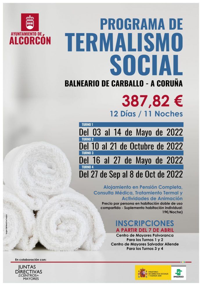 Un total de 220 personas mayores de la localidad madrileña de Alcorcón podrán beneficiarse del Programa de Termalismo gracias al Ayuntamiento del municipio. Los turnos se distribuirán durante los meses de mayo, septiembre y octubre y se desarrollarán en el Balneario de Carballo, en La Coruña, tal y como ha explicado Natalia de Andrés, la alcaldesa de Alcorcón, que ha recordado que “este programa se realiza en colaboración con el Imserso”.