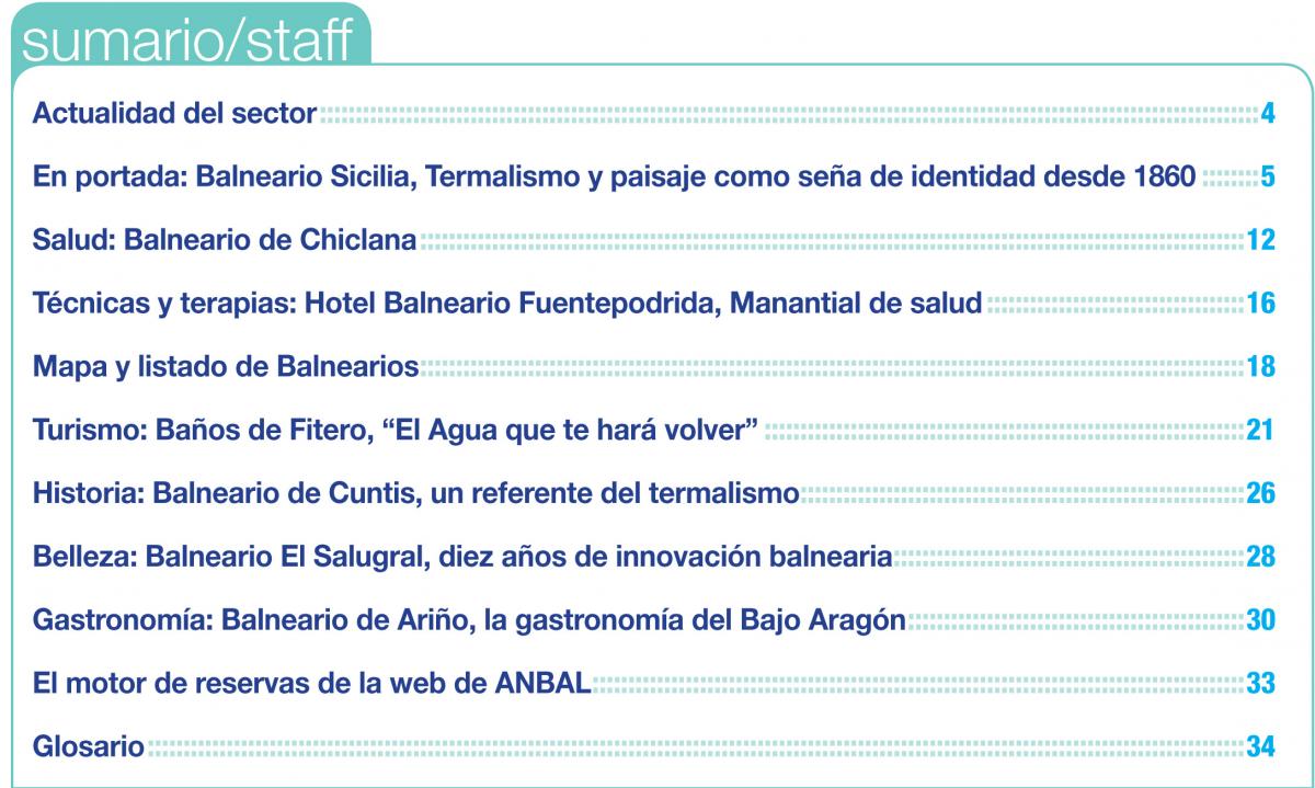 El reportaje de Portada está protagonizado por el Balneario Sicilia, que porta el Termalismo y la naturaleza como seña de identidad desde 1860; cuya oferta está incluida en el motor de reservas que incorpora la web www.balnearios.org. Por su parte, el presidente de ANBAL Miguel Mirones se ocupará en el editorial de repasar la proyección internacional de la Asociación Nacional de Balnearios gracias a su participación en ferias y eventos sobre Turismo de Salud.