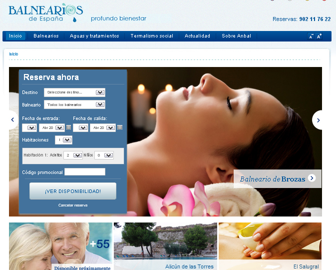 El cambio más significativo reside en la incorporación de un motor de reservas desde el que se puede contratar de forma directa toda la oferta disponible en los Balnearios incorporados a ANBAL. Esta herramienta de reservas de estancias y servicios complementarios en los Balnearios ocupa el lugar más destacado del site web, invitando al usuario a acceder a ella para encontrar las ofertas disponibles y formalizar la reserva sin salir de la página. El desarrollo de esta plataforma de reservas está sustentando en la tecnología y el know-how de Idiso, empresa especialista en la comercialización de plazas hoteleras. Si a esto se le suma el excelente posicionamiento de la página web de ANBAL por búsqueda de palabras clave en los buscadores, podría convertirse en el principal canal de ventas de los Balnearios de España.