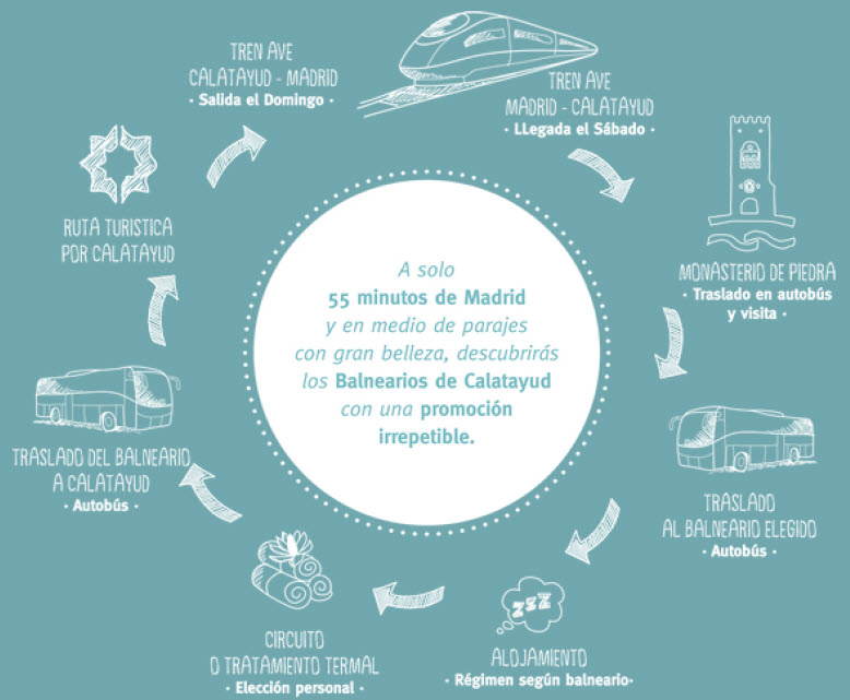 "Descubre todo un mundo de sensaciones”, así reza el claim promocional del Tren Termal, cuya oferta incluye viaje de ida y vuelta en AVE, visitas a Calatayud y el Monasterio de Piedra y alojamiento en un balneario con tratamiento termal por 135 euros. El viaje comienza a las 9.30 h. en la estación de Atocha. En tan sólo 50 minutos el viajero llega Calatayud, donde un autobús le conducirá directamente al Monasterio de Piedra, que representa uno de los monumentos naturales más espectaculares de España.