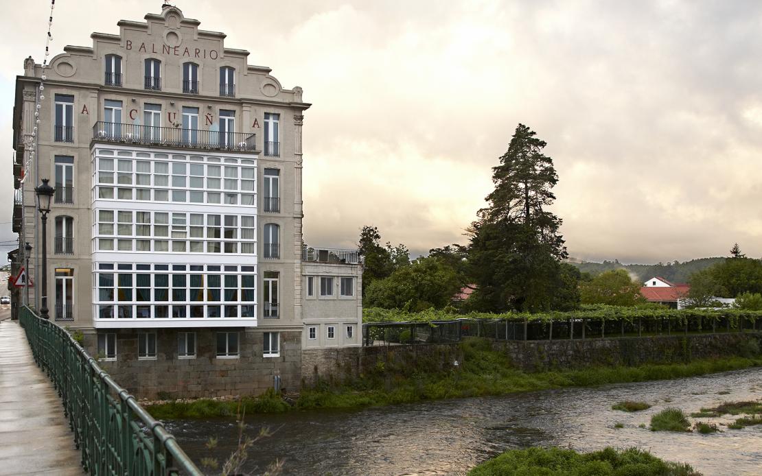 Le bâtiment de l'hôtel-station thermale est situé au centre de Caldas de Reyes. Il s'agit d'un ensemble architectural doté de hautes galeries donnant sur la rive droite de l'Umia. Sa vaste salle à manger offre une vue sur le fleuve et sur un grand jardin.