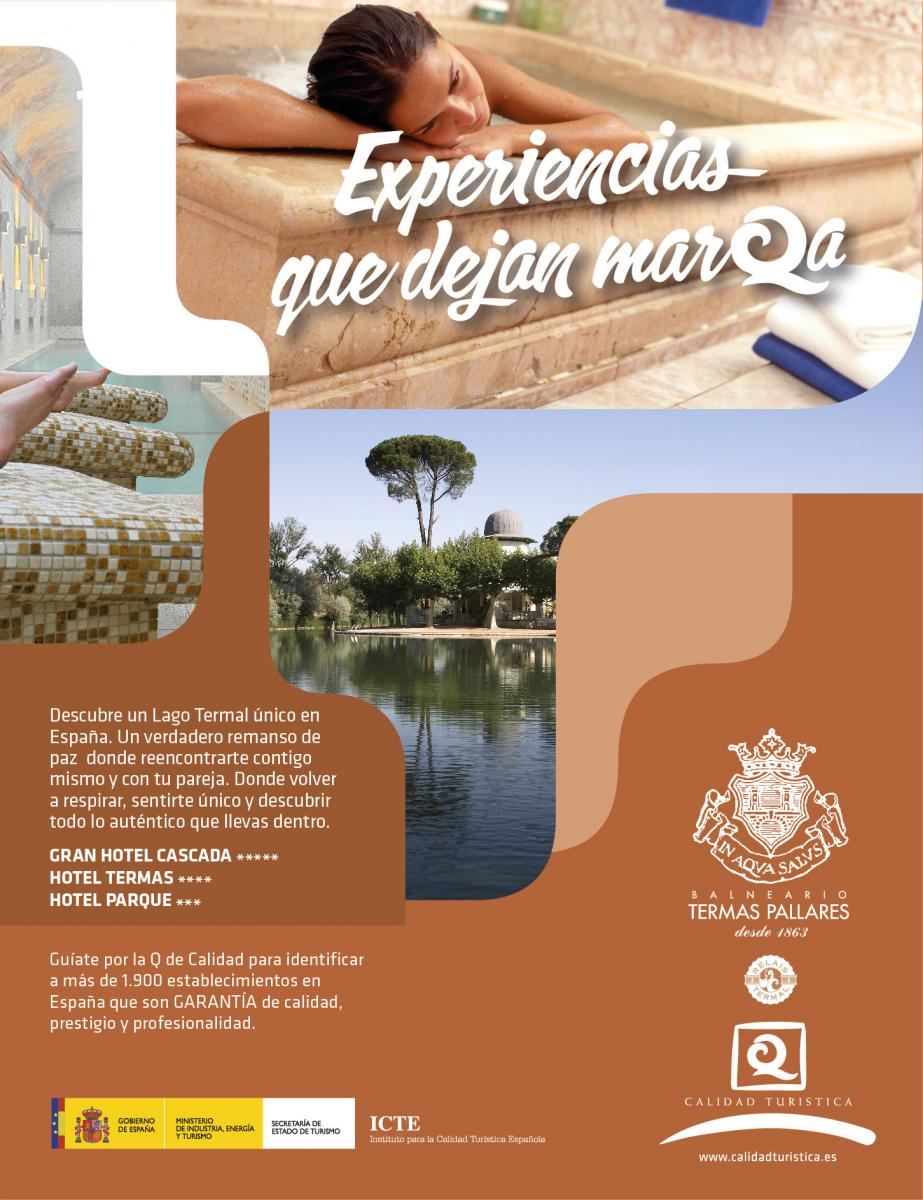 Experiencias que dejan marQa - BalneariosEl sector termal está siendo objeto de promoción entre el público español gracias a la campaña publicitaria en medios impresos que el Instituto para la Calidad Turística Española ha puesto en marcha en colaboración con la Secretaría de Estado de Turismo, las Comunidades Autónomas y algunas empresas certificadas. Bajo el lema “Experiencias que dejan marQa”, la acción publicitaria promocionará hasta final de año los destinos certificados con la marca “Q” de Calidad Turística utilizando como vehículo la experiencia positiva de los turistas en los destinos certificados.